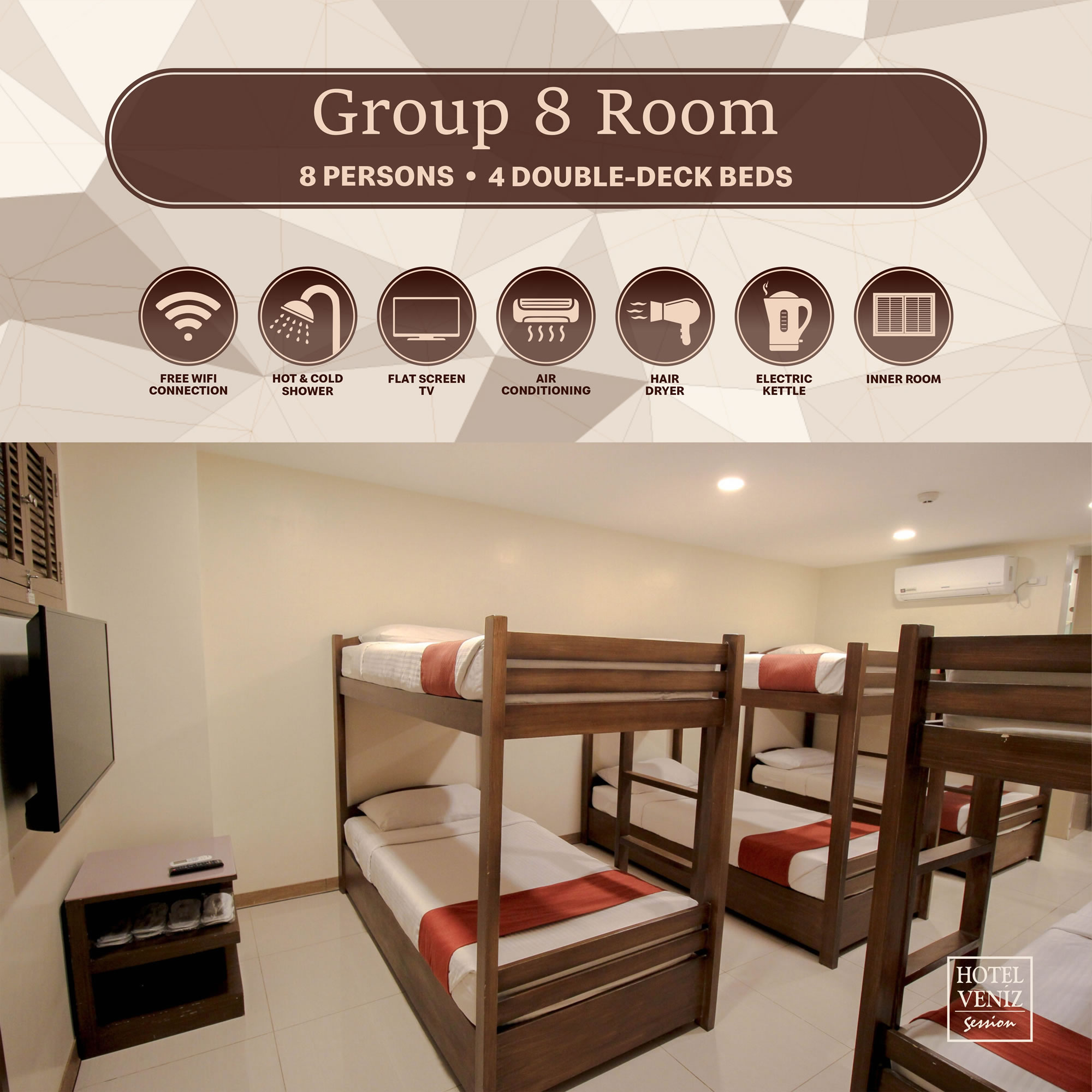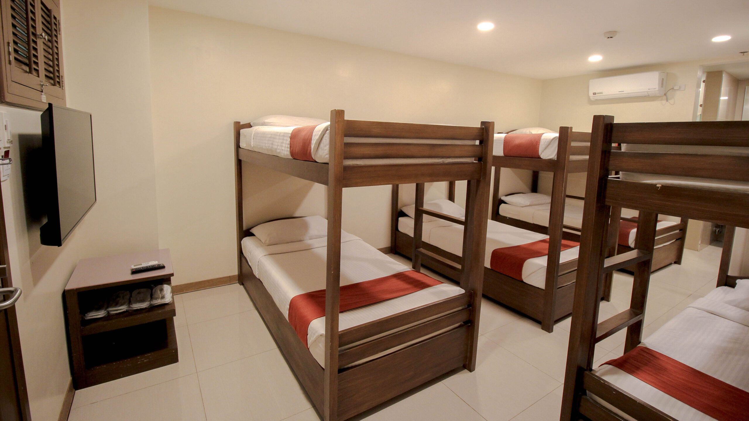 Details Adults: 8 Amenities: Air-Conditioning, Free Wi-Fi, Hair Dryer, Shower, TV View: None, Inner Room Bed Type: 4 Double Decks Prices start at: ₱6,595 per night Required fields are followed by * Check-in Date * Check-out Date * Adults 1 2 3 4 5 6 7 8 9 10 11 12 13 14 15 16 17 18 19 20 21 22 23 24 25 26 27 28 29 30 Children 0 1 2 3 4 5 6 7 8 9 10 The Barkada room for 8 has four (4) double-deck beds perfect for family or friends who would like to have bonding moments together.
